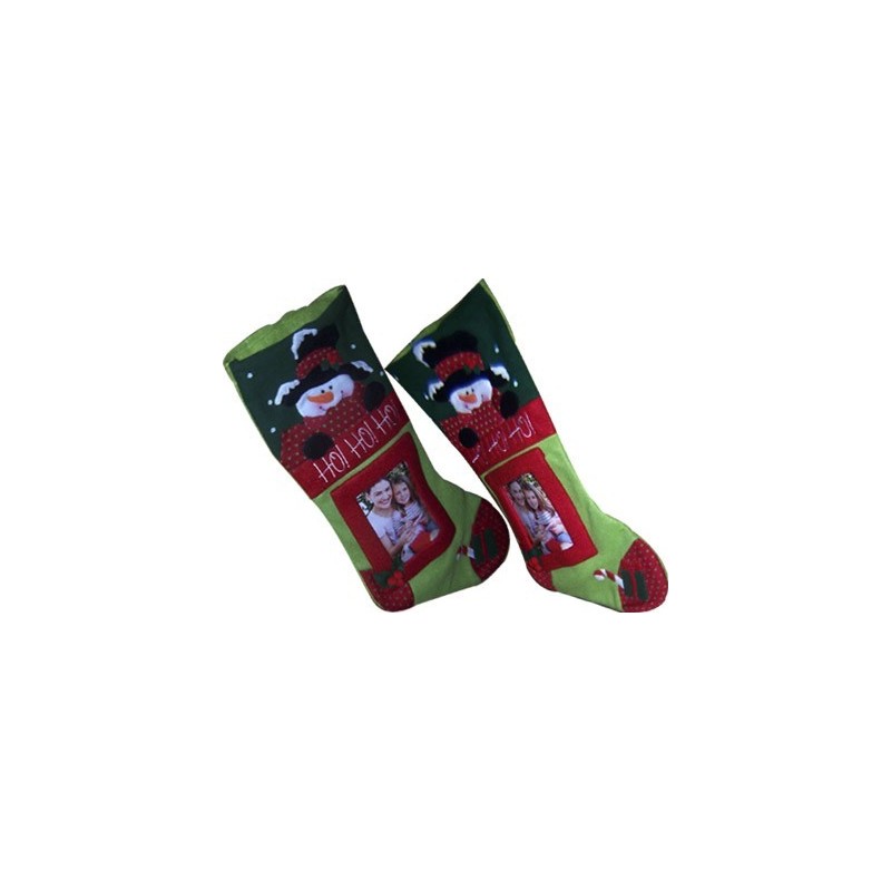 El calcetín lleva bordado un muñeco de nieve, junto a la risa de Papá Noel ("Ho! Ho! Ho!"), además de estar decorado con una hoja de árbol de Navidad, un regalo típico navideño y la foto que desees (preferiblemente en vertical)